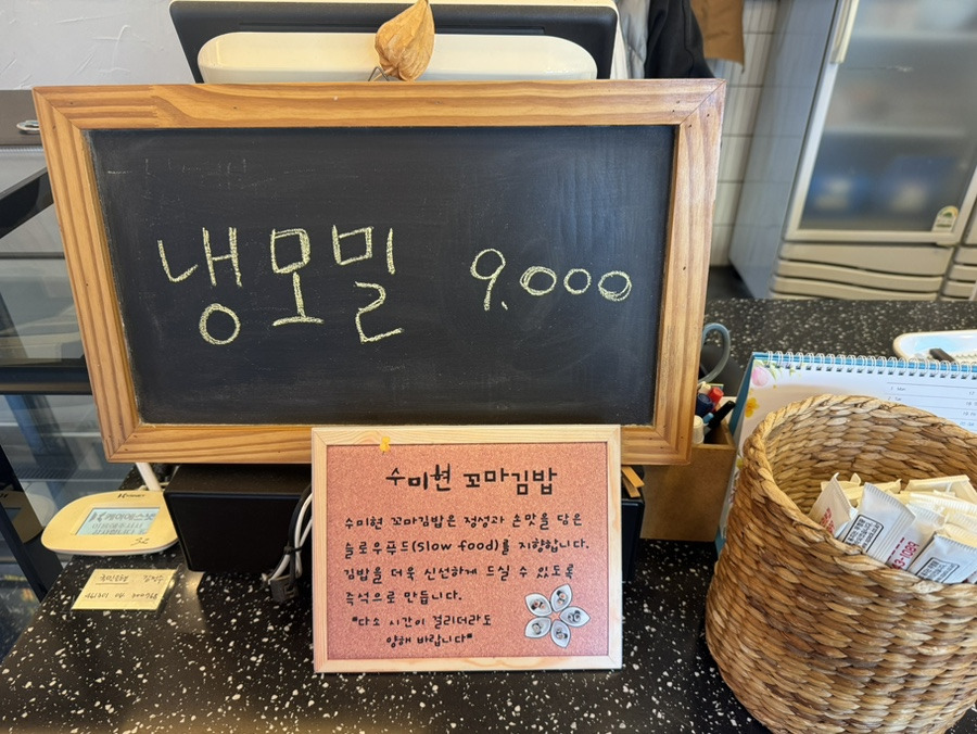 메뉴판은 꼬마김밥, 한 줄 김밥, 사이드까지 있었고