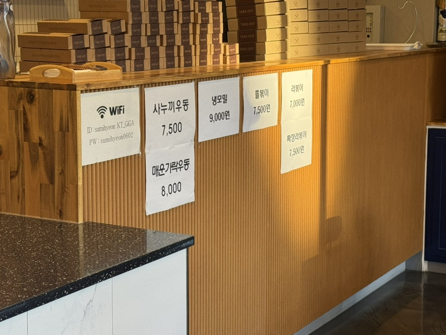 저흰 수미현김밥 4,500원, 생와사비참치김밥 5,600원, 사누끼우동 7,500원, 라볶이 7,000원
